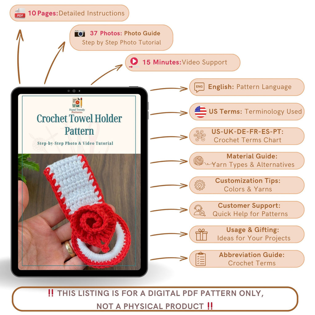 Crochet towel holder pattern is a functional and decorative design created for kitchens, bathrooms, and household organization projects. This downloadable PDF includes clear, beginner-friendly instructions to help you create a stylish handmade accessory that keeps towels neatly in place. The rose element and sturdy loop make this craft pattern ideal for DIY décor, practical home use, and handmade gift ideas. All SEO tags are naturally blended throughout the description.