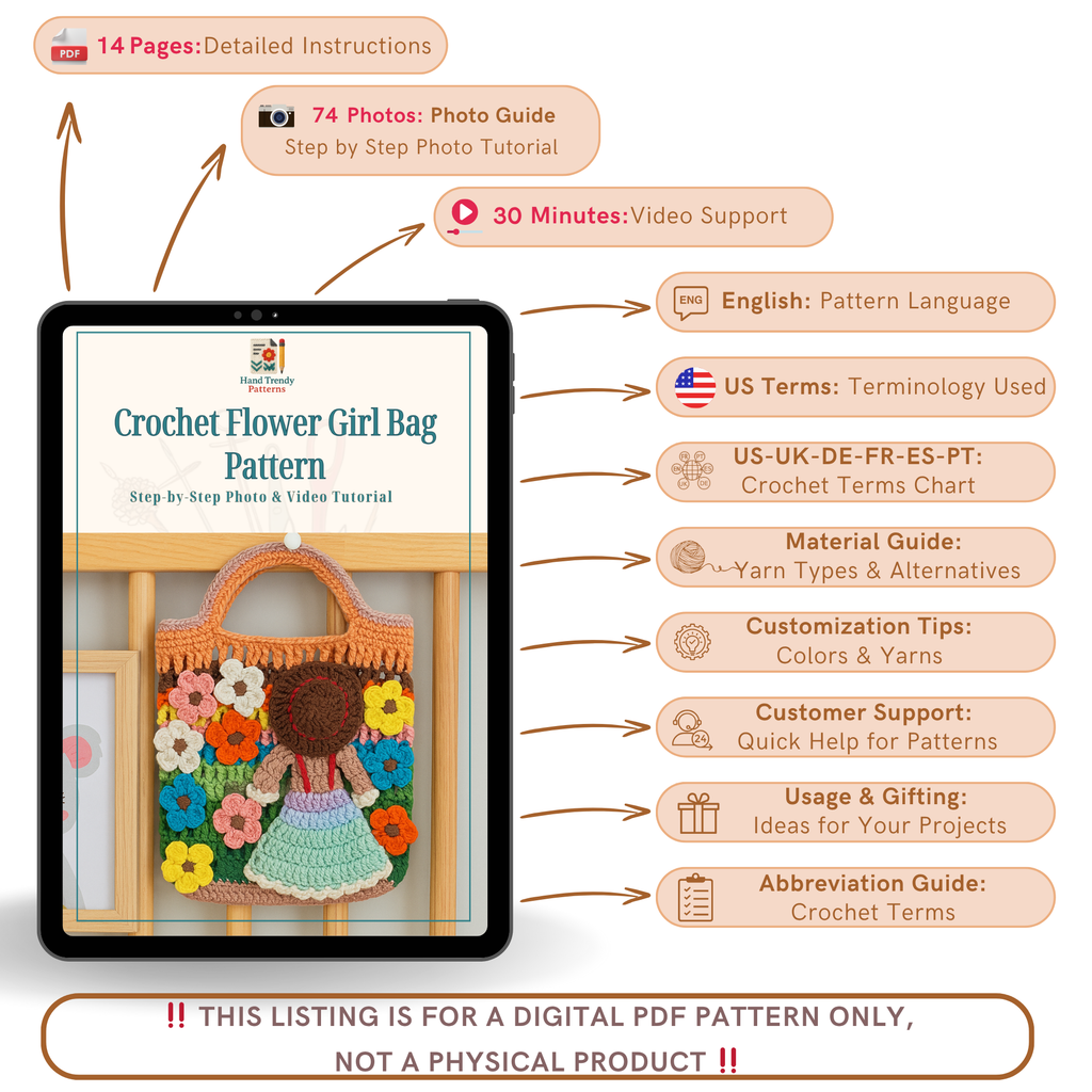 Create a stunning and playful Crochet Flower Girl Bag Pattern that celebrates color, texture, and creativity! This crochet pattern is designed as a handmade crochet tote filled with cheerful flowers and a charming girl figure wearing a dress and hat. Perfect for those who love crochet decor, handmade crochet accessories, and cute kids’ fashion.
