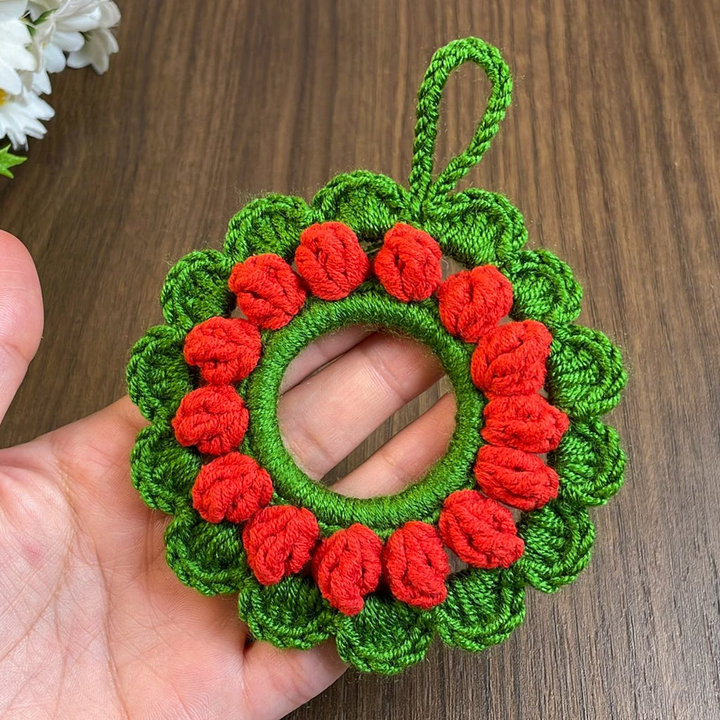 Designed with simple crochet stitches, this project is beginner-friendly and quick to make. The circular ring base adds a modern twist to the traditional Christmas wreath, while the layered puff stitches create a textured and elegant finish. Whether you’re decorating your home or gifting a handmade touch, this pattern helps you craft something timeless and joyful.