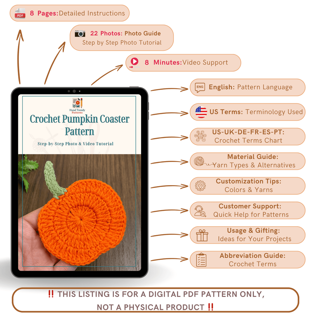 This pumpkin coaster crochet pattern is an instant digital download. Once purchased, youโ€™ll receive a PDF file ready to use. Add some handmade charm to your home this fall with this easy and creative design!