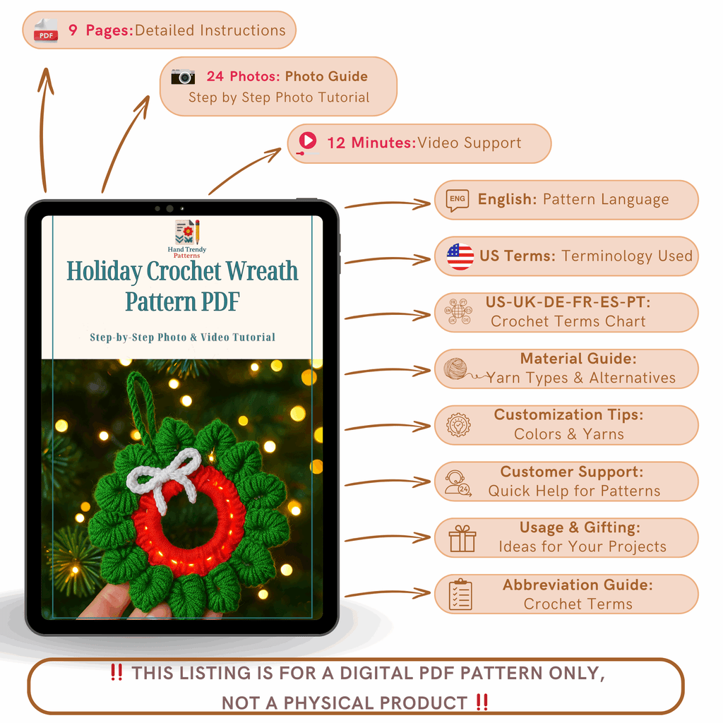 This instant download crochet file offers a handcrafted, authentic touch to your holiday decor, perfect as a thoughtful gift or as a festive decoration for your home. Handmade with love, this pattern highlights the beauty of crochet craftsmanship and is ideal for gift-givers who enjoy personal, homemade touches. To maintain your wreath’s beauty, store it in a cool, dry place and lightly dust as needed. For best results, hand wash gently and lay flat to dry.