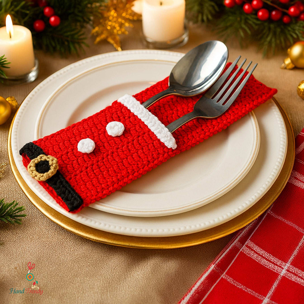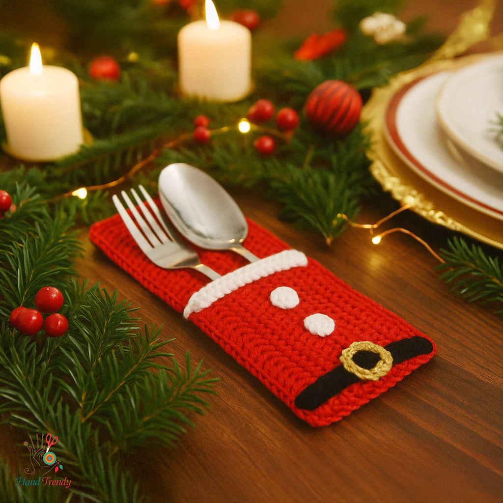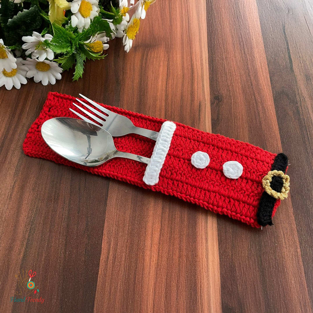 - This digital pattern creates a festive utensil pouch shaped like Santa’s iconic outfit