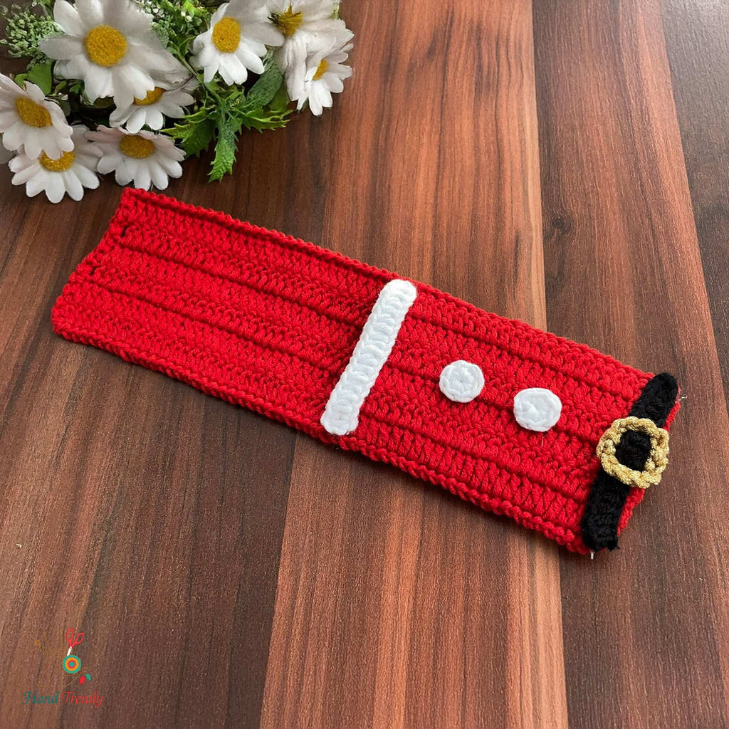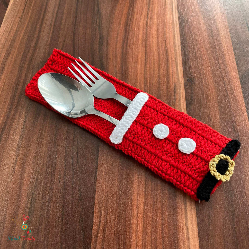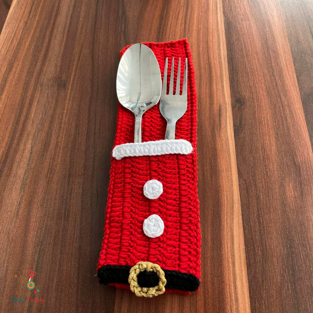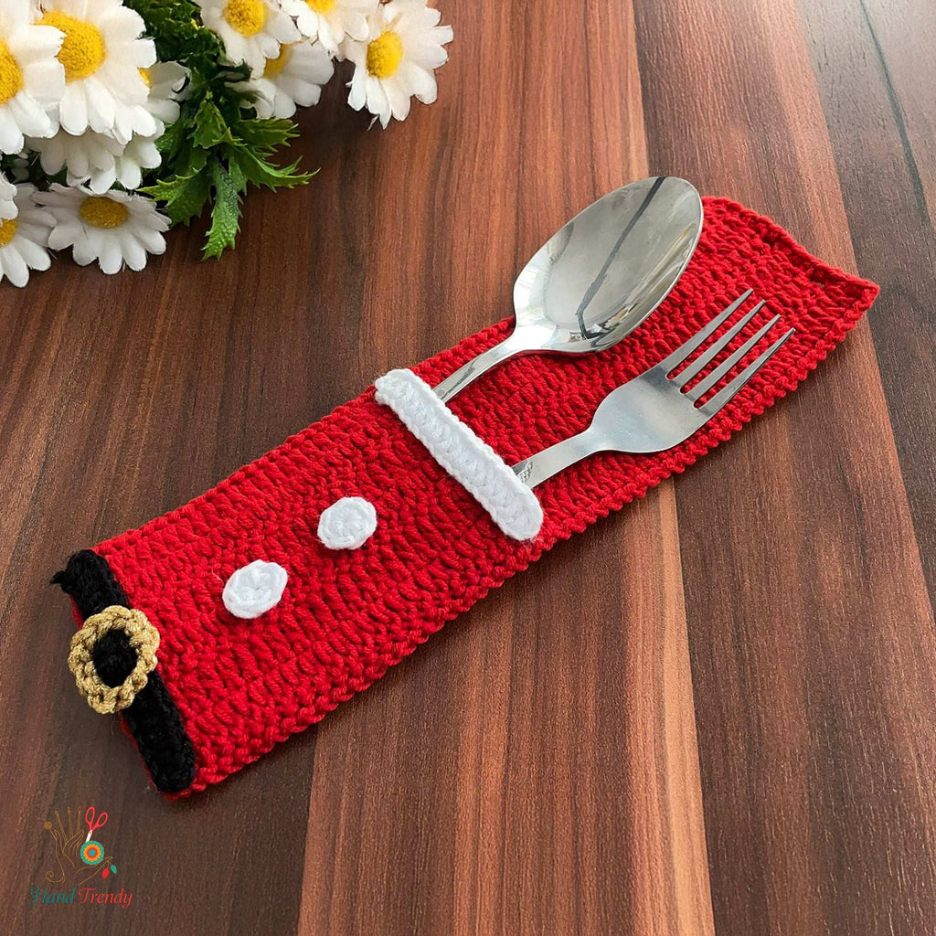 - This digital pattern creates a festive utensil pouch shaped like Santa’s iconic outfit