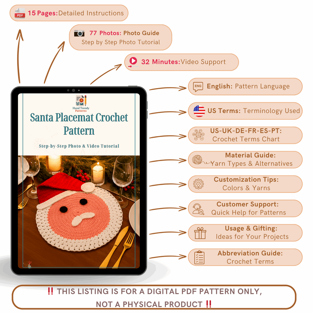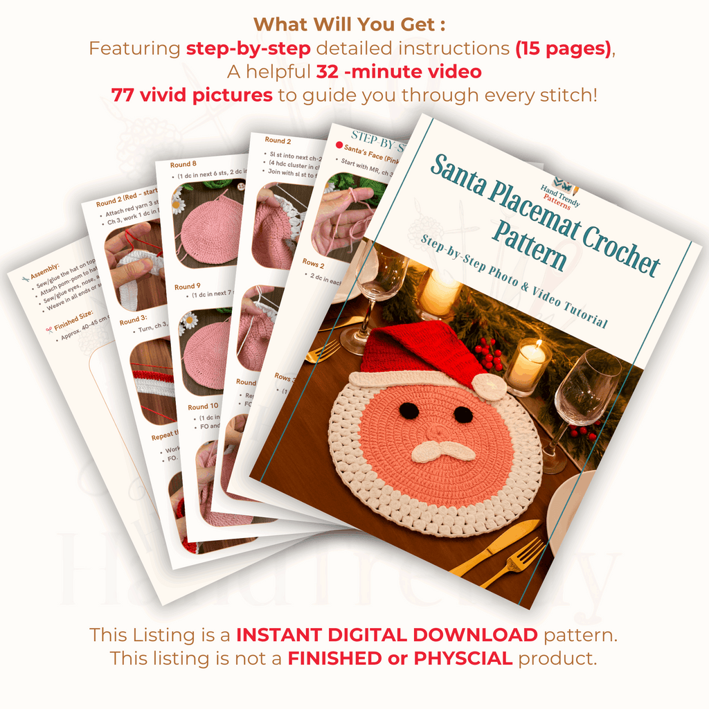 This Santa placemat crochet pattern is designed for holiday crafters who want to add a handmade touch to their Christmas decor. The PDF includes step-by-step tutorials, clear photos, and patterns for creating a cheerful Santa face that beautifully decorates your table. Whether you're an experienced crocheter or a beginner looking for a festive project, this pattern offers a satisfying and creative way to celebrate the season. Its versatility also makes it a thoughtful handmade gift idea for friends and family who love holiday crafts.