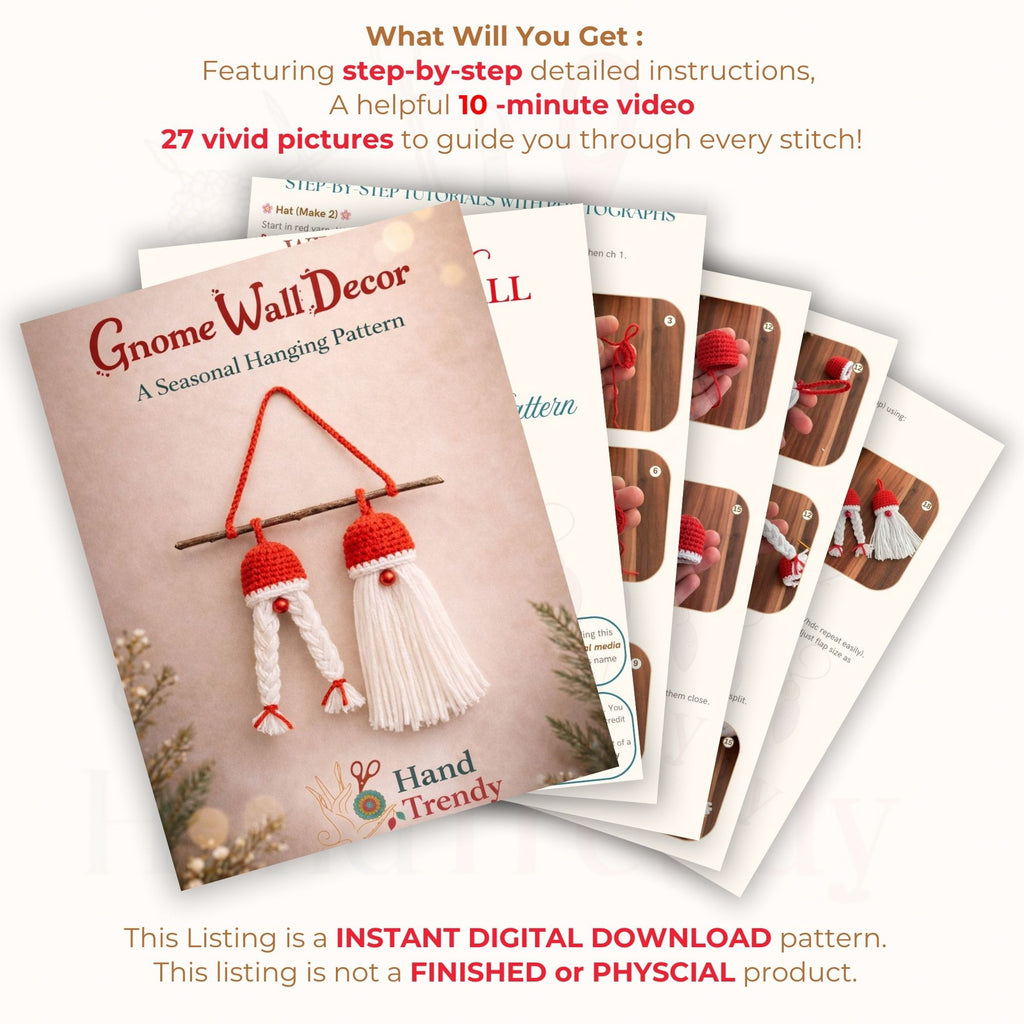 Christmas Gnome Wall Hanging Pattern is a digital PDF crochet pattern designed for creating decorative hanging gnome ornaments for seasonal home styling. This pattern focuses on a cozy, handcrafted aesthetic inspired by Scandinavian decor traditions and modern handmade wall art.