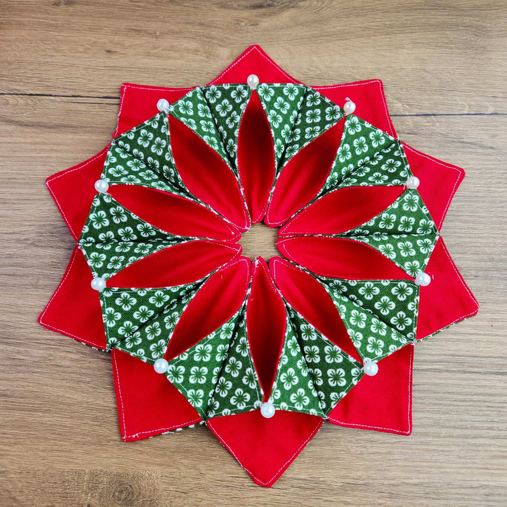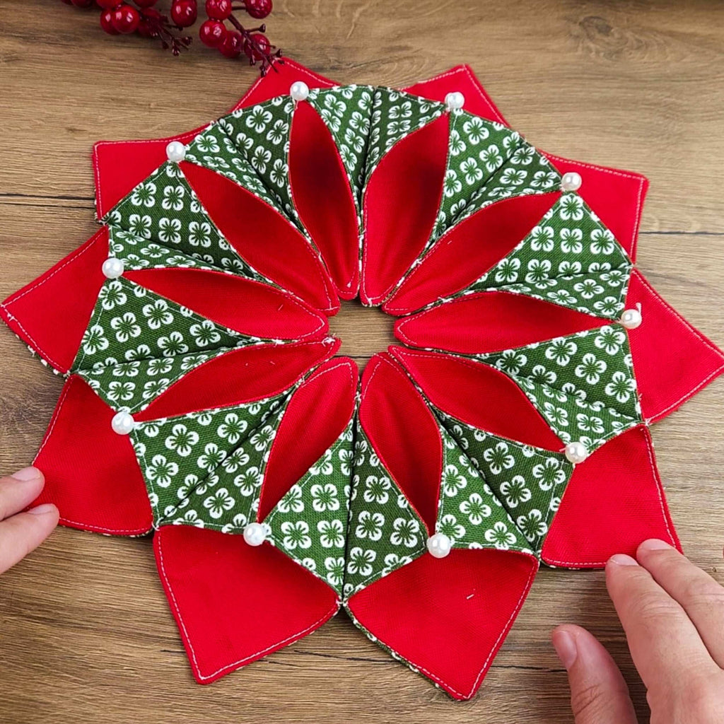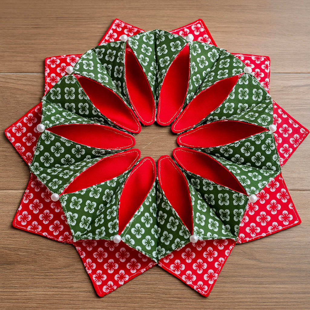 This folded fabric table topper creates a stunning 3D poinsettia-style design using red and green fabrics โ perfect for candles, vases, or centerpieces.