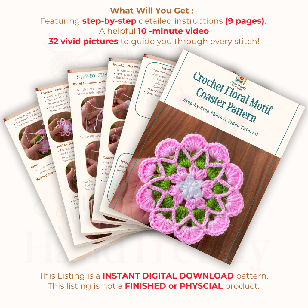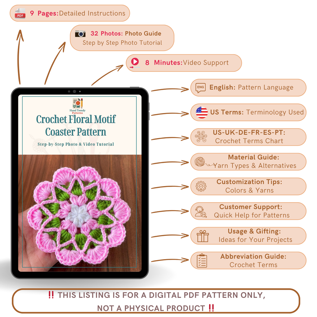 • 🌼 Perfect for making coasters, table settings, wall decorations, or joining multiple motifs for larger crochet projects
