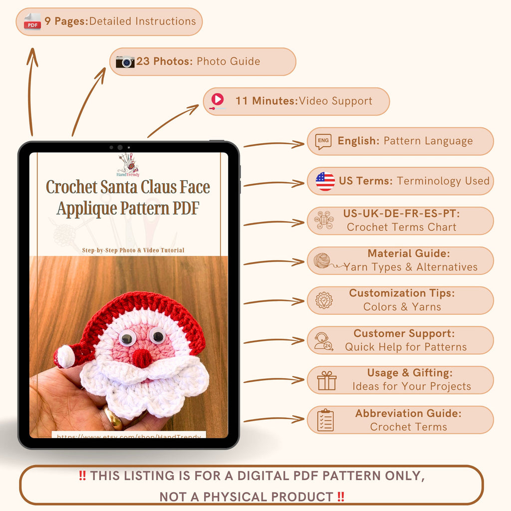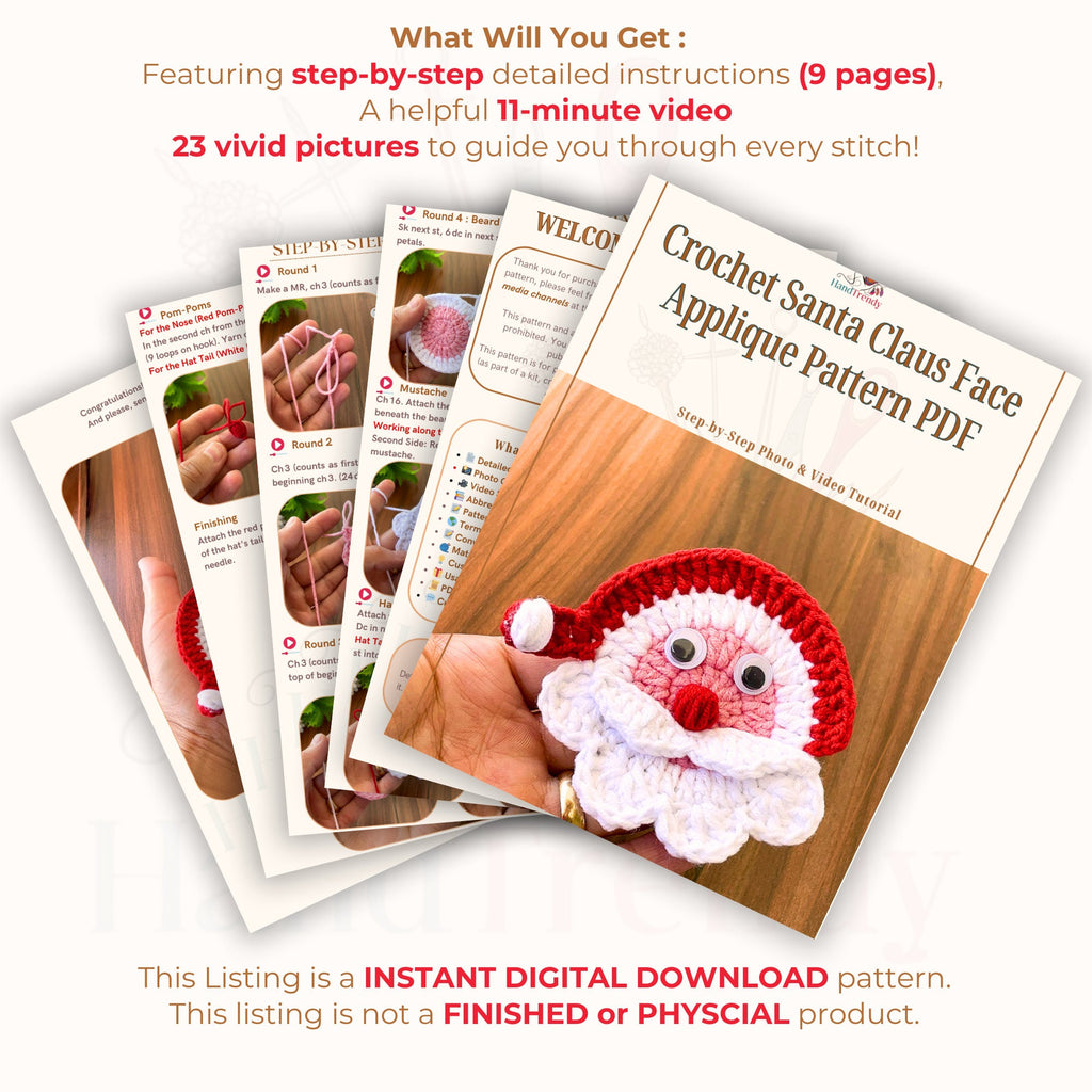 Introducing our **Crochet Santa Claus Face Applique** pattern PDF, a charming addition to your holiday decorations! This beautifully designed crochet pattern will allow you to create a delightful Santa Claus face that can be used for various Christmas settings, enhancing your indoor ambiance. The finished applique is perfect for adorning your Christmas tree, decorating your holiday table, or even as a unique gift for friends and family who appreciate handmade crafts.